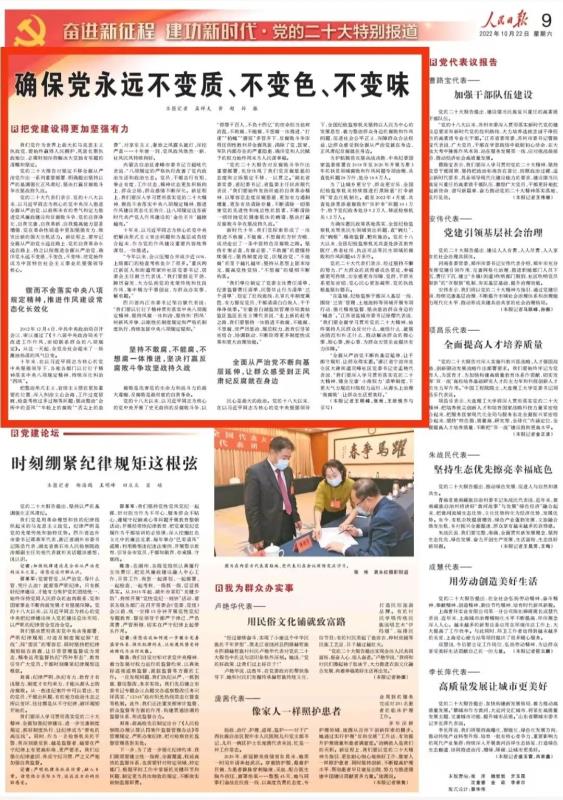 黨的二十大代表們表示,黨的十八大以來,以習(xí)近平同志為核心的黨中央深入推進(jìn)全面從嚴(yán)治黨,以前所未有的勇氣和定力推進(jìn)黨風(fēng)廉政建設(shè)和反腐敗斗爭,黨的自我凈化、自我完善、自我革新、自我提高能力顯著增強(qiáng),黨在革命性鍛造中更加堅(jiān)強(qiáng)有力,煥發(fā)出新的強(qiáng)大生機(jī)活力。新征程上,要牢記全面從嚴(yán)治黨永遠(yuǎn)在路上,黨的自我革命永遠(yuǎn)在路上,持之以恒推進(jìn)全面從嚴(yán)治黨,確保黨永遠(yuǎn)不變質(zhì)、不變色、不變味,使黨始終成為中國特色社會主義事業(yè)的堅(jiān)強(qiáng)領(lǐng)導(dǎo)核心。